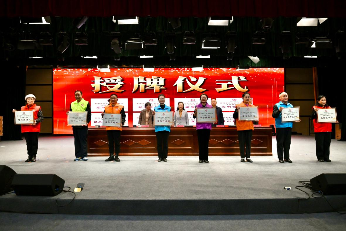 仪式上,与会人员共同观看了“银龄黔行”志愿服务宣传视频。省委社会工作部、省委老干部局、省民政厅、省老龄办、贵州老年大学相关负责同志为“思政宣讲队”“芳华讲解队”“桑榆宣研队”“文明礼仪队”“银龄之声宣讲队”“文化艺术团”“反诈宣传团”“爱心妈妈团”8支志愿服务队伍授牌。各志愿服务团(队)代表庄严宣誓,表达奉献社会、服务群众的决心。仪式结束后,与会人员观看了老年志愿者带来的文艺演出,节目精彩纷呈,展现了新时代老年人积极向上的精神风貌。