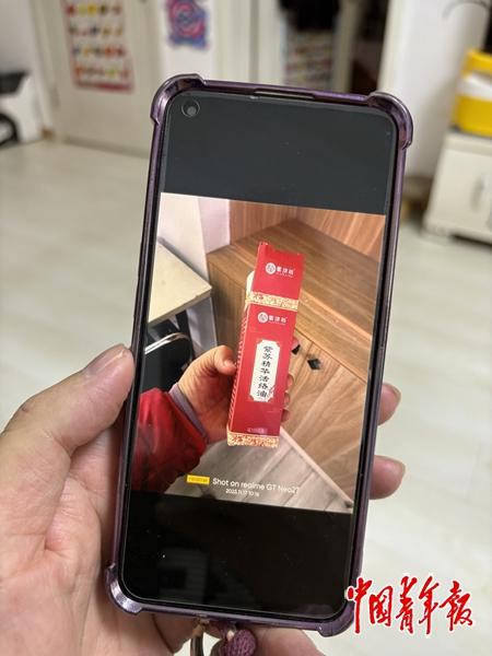 受访者向记者展示紫苏生活超市销售的“紫苏精华活络油”。杨雷/摄
